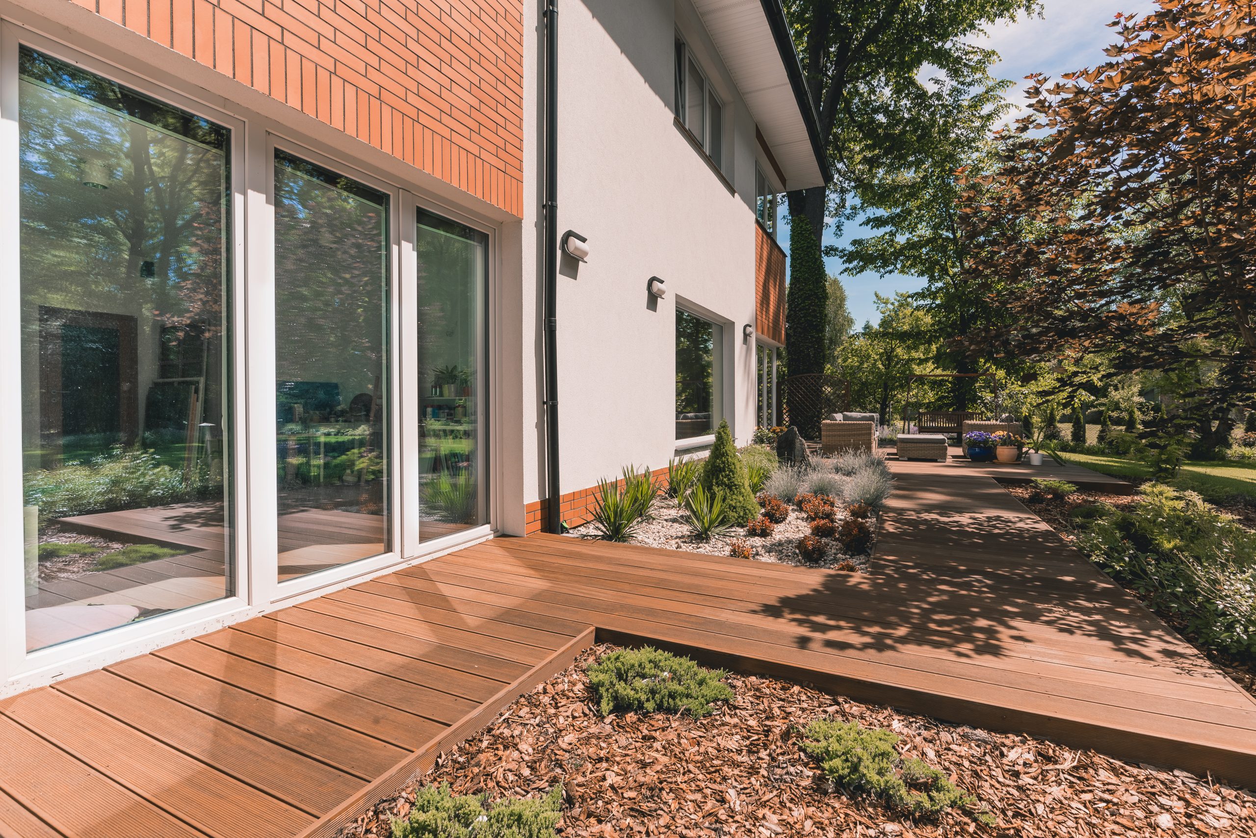 Use a moderate layer (typically 2–3 inches) and keep mulch a few inches away from your home’s exterior.